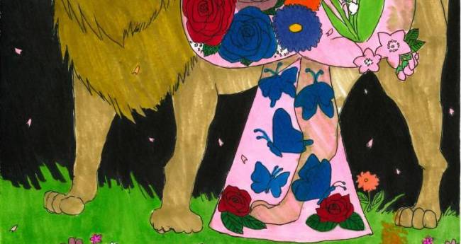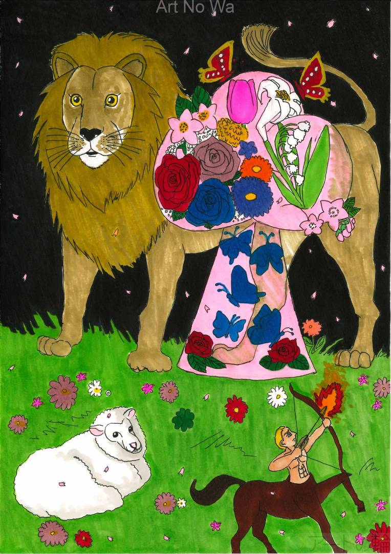 非現実,屋外,自然,春,4月,赤,オレンジ,黄色,緑,青,黒,動物,植物,想像上の生き物,男性,暗い