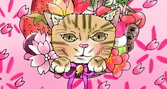 色んな春の味覚に囲まれたリースの穴に顔をはめているトラ猫を描いてみました。