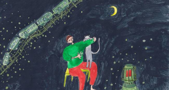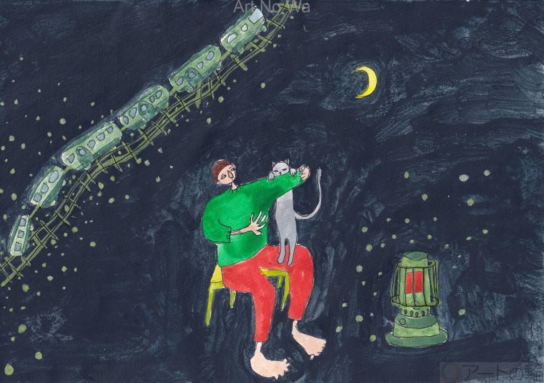 251117 toki ある冬の一日を無事に終えて和みながら猫と戯れるひとの様子。家のすぐ傍を走る電車がのどかに音を立通り過ぎていく、そんな、何気ない一日の終わりです。