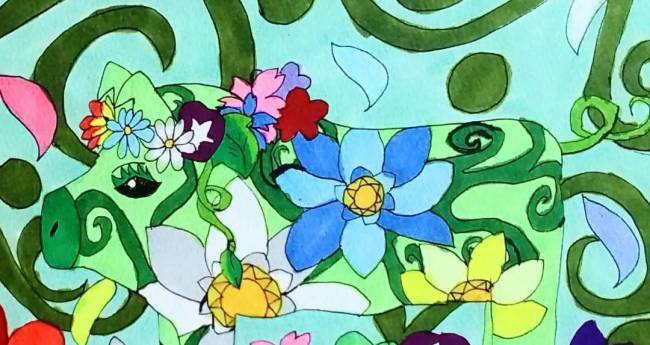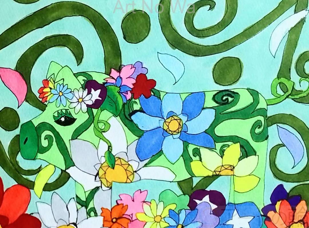 花の香りを感じている唐草模様&花模様の豚を描いてみました。