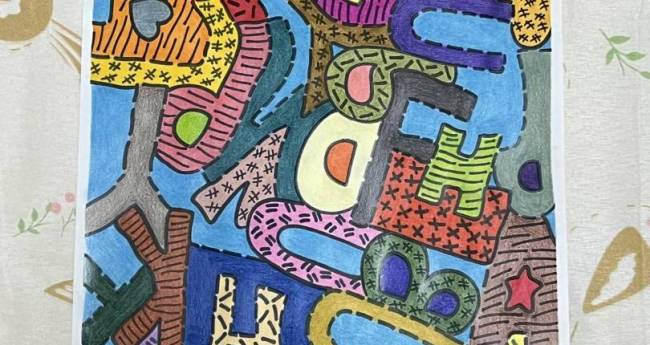 たくさんのアルファベットを重ねて描きました。バランスの良い見た目にしたくて、何種類か模様も付けました。隠れ動物も居るので、楽しんで見てもらえると嬉しいです。