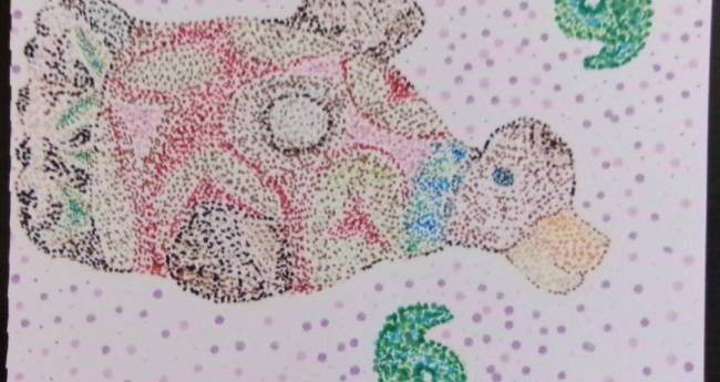 縄文展で観た動物形土製品(水鳥さん?海獣さん?)を、点描イメージイラストで描いて見ました。