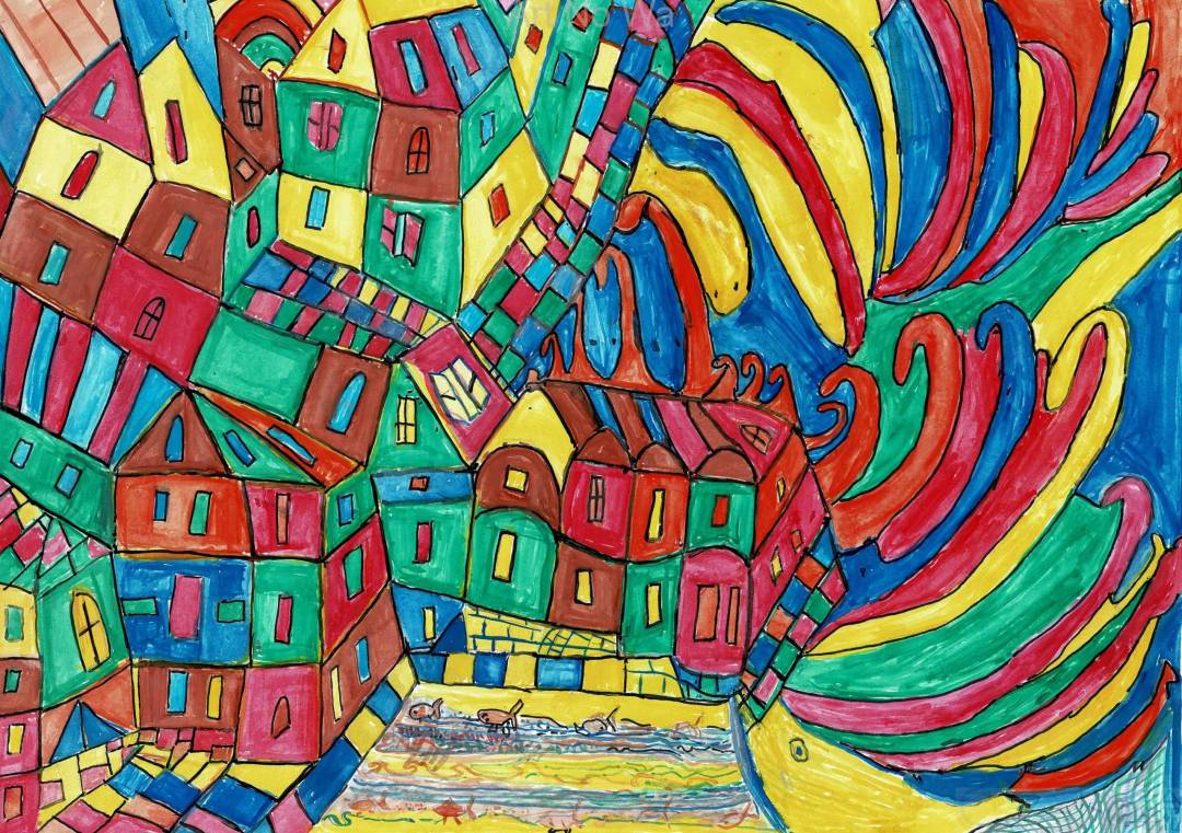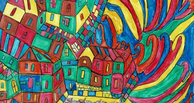 赤,オレンジ,黄色,緑,青,風景,建造物,明るい,たのしい,どきどき