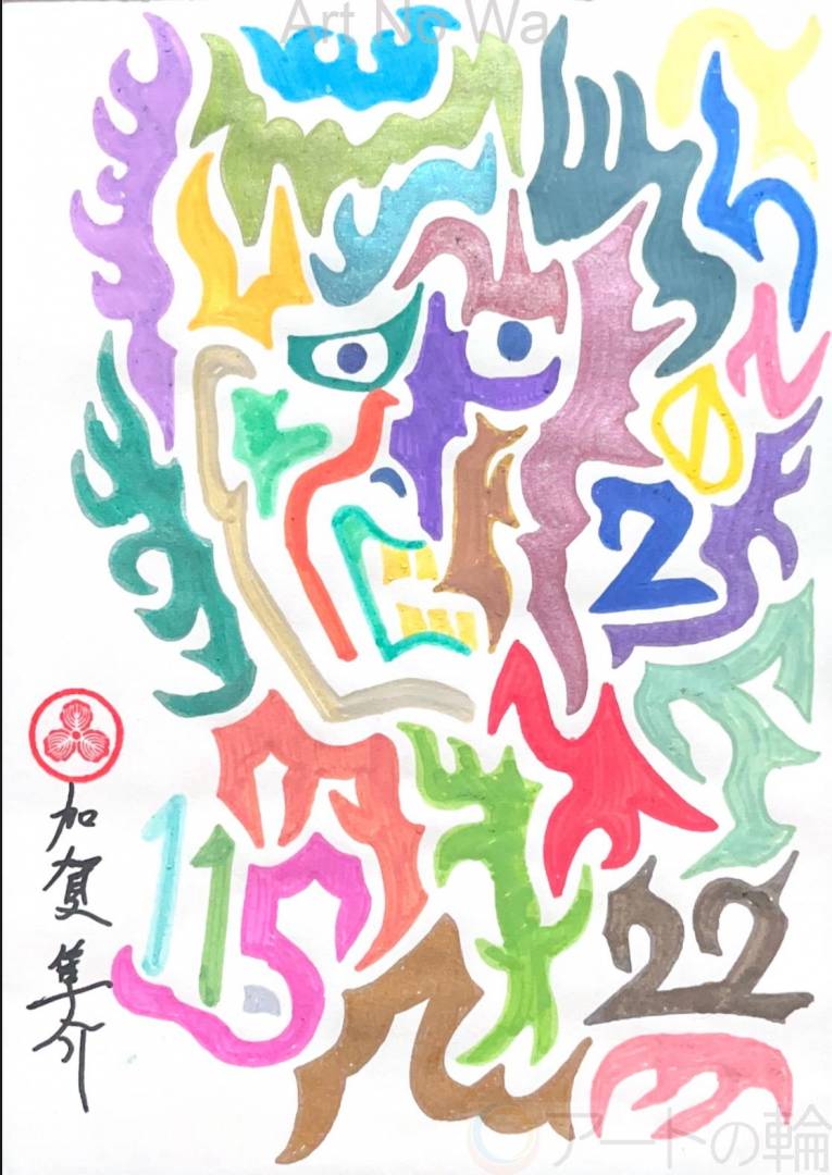この一枚では、色は氣の軌跡として流れ、 その流れの中から、一つの像が顕れた。 神道と仏法が交わる「色界」では、 形は意図から生まれず、 気配が形を結ぶ。 これは、無意識の奥から立ちあがった 顕(あらわ)れの坐す姿である。