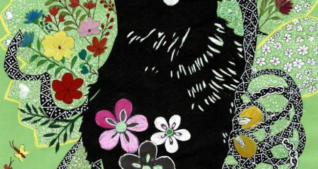 切り絵でねこと花を描きました。ねこだけだと寂しいので周りに花を描きました。