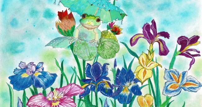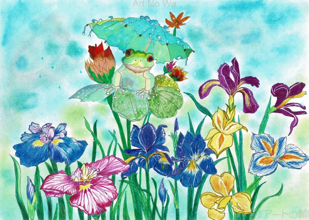 広い空の下に菖蒲が咲いています。蓮の葉を傘に蛙が雨宿りしています。