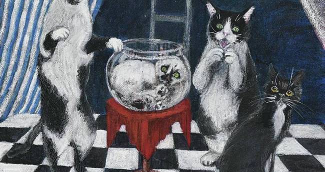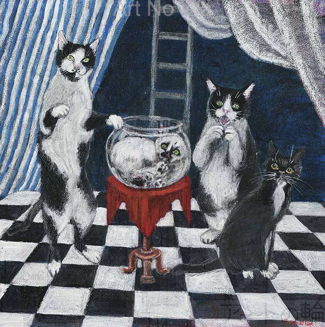 猫が好きです。 作品はアクリルとオイルパステル、色鉛筆などを使用した混合技法です。