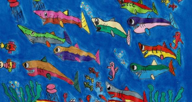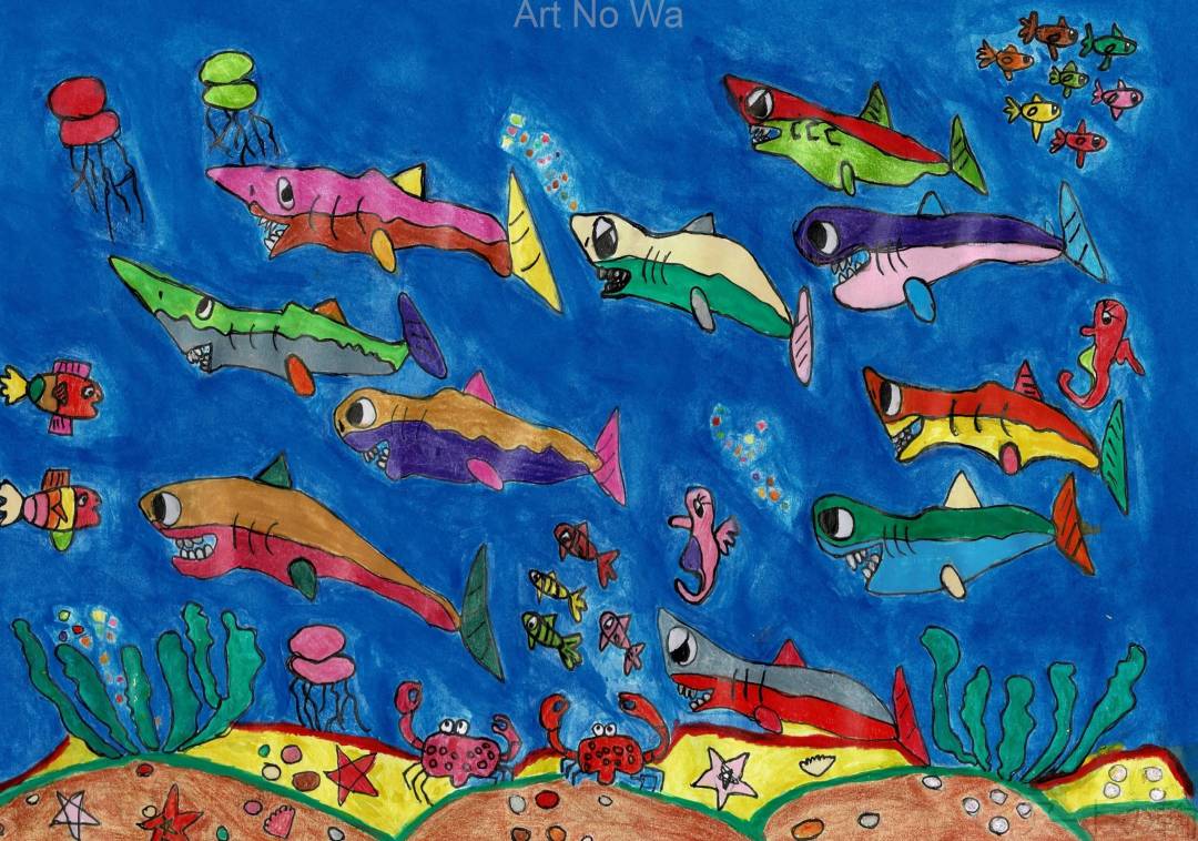 初めてサメを描きました。最初は上手く描くことができなかったけど、何回も描いていくうちにサメらしく描くことができました。楽しそうな絵が描けてよかったです。
