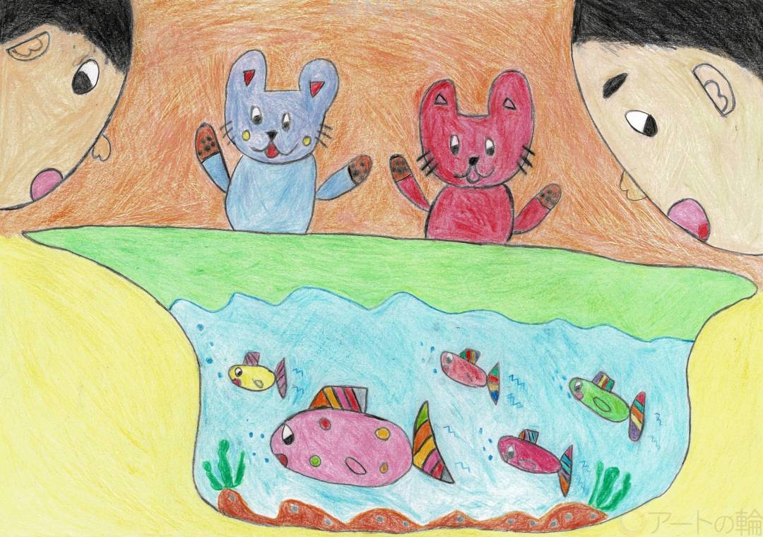 最初は金魚だけにしようかなぁと思ったけど、周りに男の子や動物を描いてみました。楽しい絵になりました。