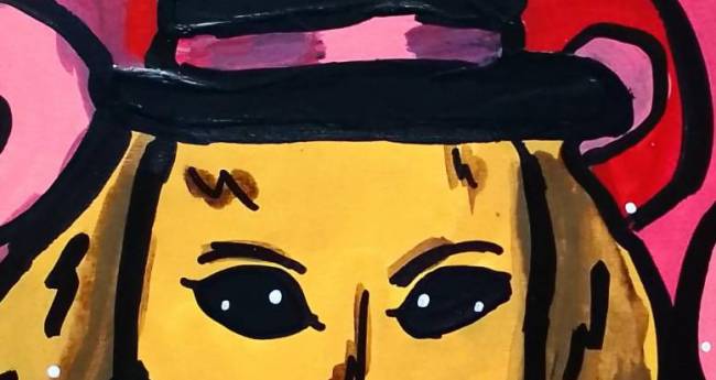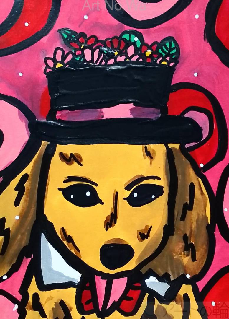 頭の部分に花が咲いている帽子を被っている犬を描いてみました。