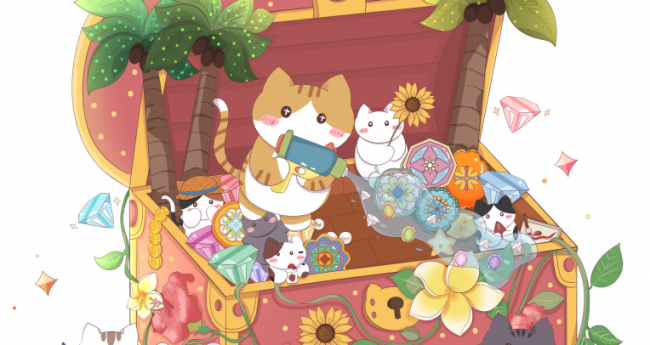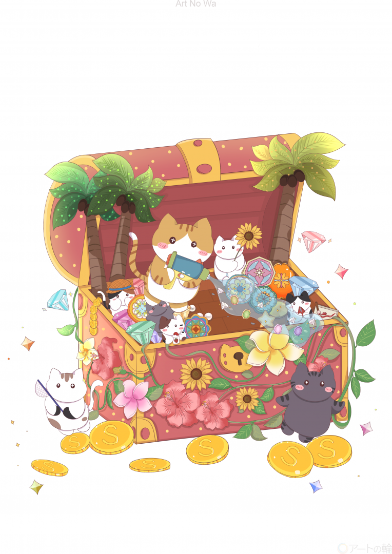 宝箱いっぱいの夏の宝物が、猫たちのまわりでそっと広がっていく様子を描きました。 色と光を散りばめて、未来へ続く輝きのイメージを表現しています。
