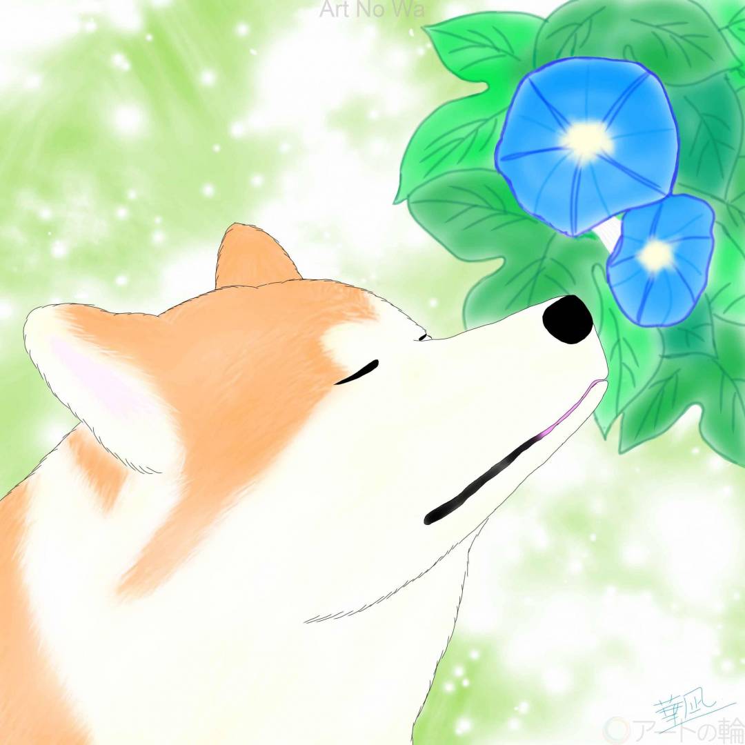 シリーズで、花と秋田犬を描き始めました。今回は、あさがおと秋田犬です。うっとりした表情がポイントです。