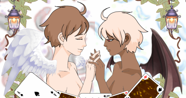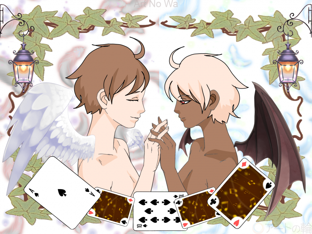 スペードの例えに光と影があり、そこに着目してみた結果天使と小悪魔が浮かびでも差別のような表現になるのではと思い、髪の色をお互いの肌の色を使ったり背景の羽根の色を天使の背景色を少しダークにし、小悪魔の方を明るい羽根の色にする事で少しでも差別感を無くしてみました。
