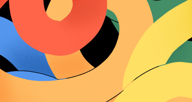 知恵の輪をコンセプトに、さまざまな色が力強く曲がりあう様子を表現しました
