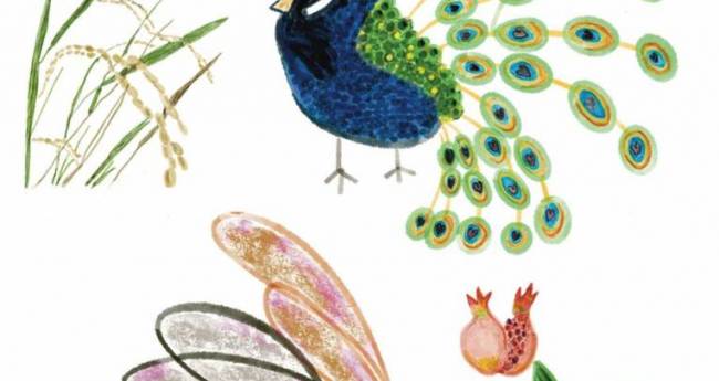 春にきれいな羽根を広げるインドのくじゃく。くじゃくが食べる、お米やざくろや、ぶどうをかきました。自然のきれいな色で、くじゃくが食べるものは私たちの体にも大切です。くじゃくも人もなかよくしながら、生きていけたらいいな。