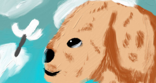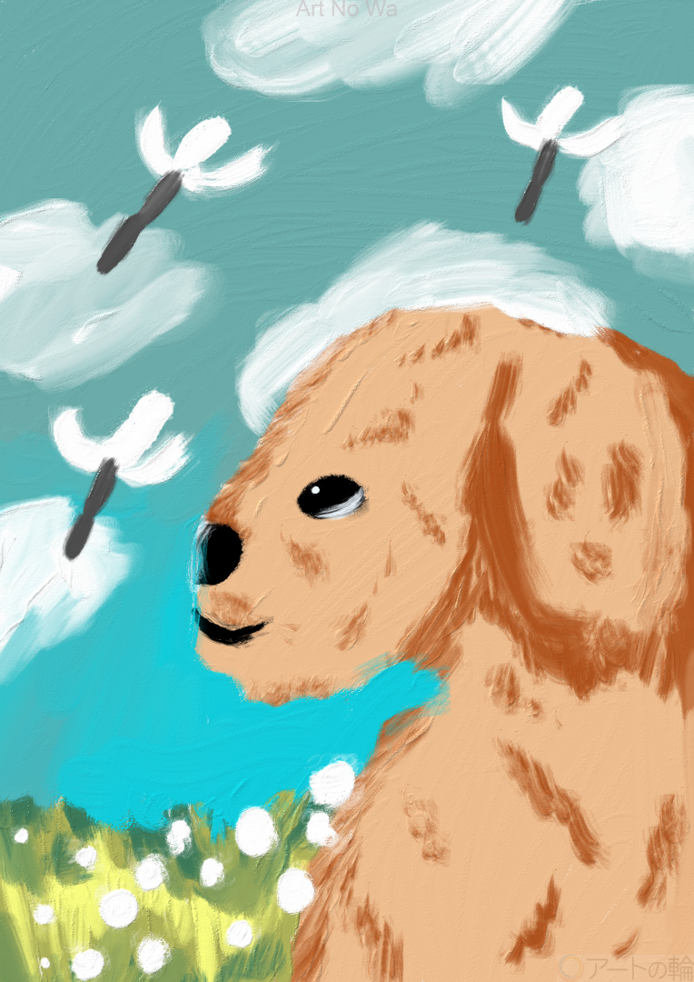 空を舞って飛んでいる綿毛を見ている犬を描いてみました。