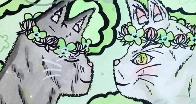 クローバーの花冠をして見つめあって嬉しそうな黒猫と白猫を描いてみました。