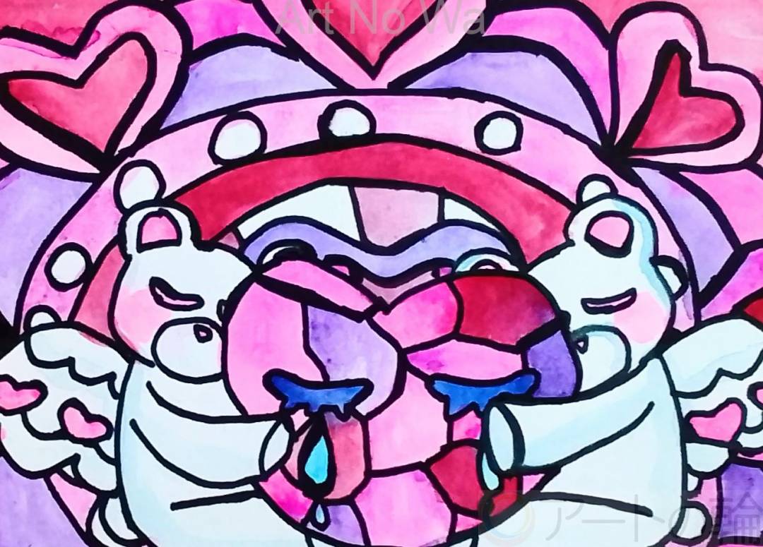 悲しい気持ちになって泣いているハートを抱きしめている白くまの天使を描いてみました。
