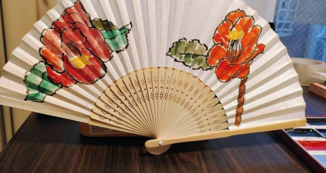 冬と言えば、椿をイメージされる方も多いのでは無いでしょうか?寒い中でも、しっかり前向きに生きる姿を見ると勇気を貰えます。扇子独特の凹凸があり、難しかったのですが楽しく描けましたまで