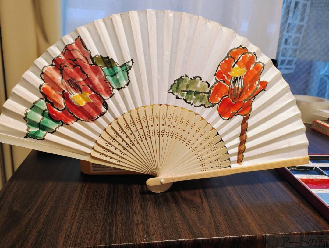 冬と言えば、椿をイメージされる方も多いのでは無いでしょうか?寒い中でも、しっかり前向きに生きる姿を見ると勇気を貰えます。扇子独特の凹凸があり、難しかったのですが楽しく描けましたまで