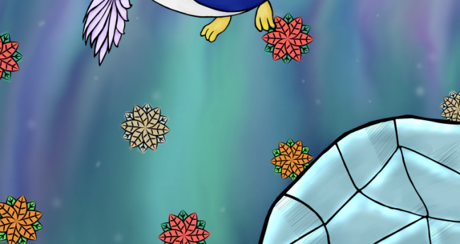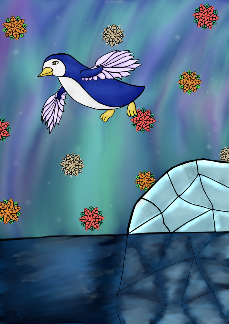 ペンギンがオーロラの空へと羽ばたく姿と雪の結晶とポインセチアをミックスしたモチーフに注目してほしいです。