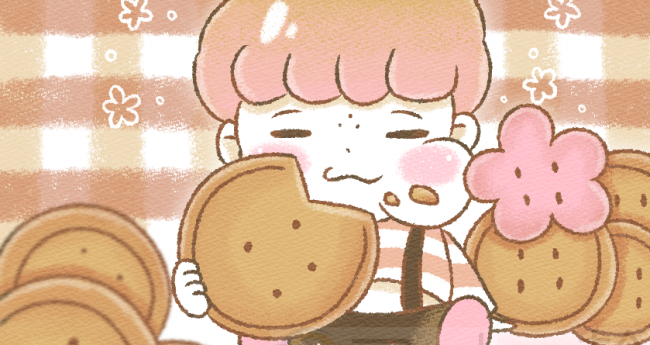 ボタン型の大きなビスケットをお腹いっぱい味わう子供です。