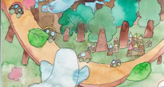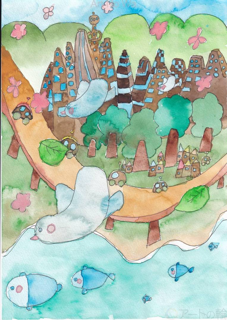 「温暖化が進みコンクリートの街には暑くて住めなくなったため、木材が見直されてできた新しい都市像を想像して描きました。きれいな空気で生き物は暮らしやすく楽しくなりました。」