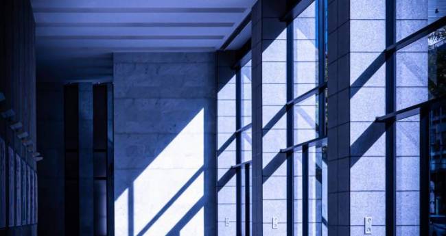 大窓から降り注ぐ光が、静かなロビー空間を青いベールで包み込みました。建物の端正な構造と、床いっぱいに敷き詰められた幾何学的な影のパターンが、**幾重にも重なり合いながら、空間に確かなリズムを生み出しています。**この凛とした青の世界で、左下の小さな柵だけが、そっと置かれた温かい色彩のアクセントとなり、静寂の中に「時の流れ」を感じさせてくれます。