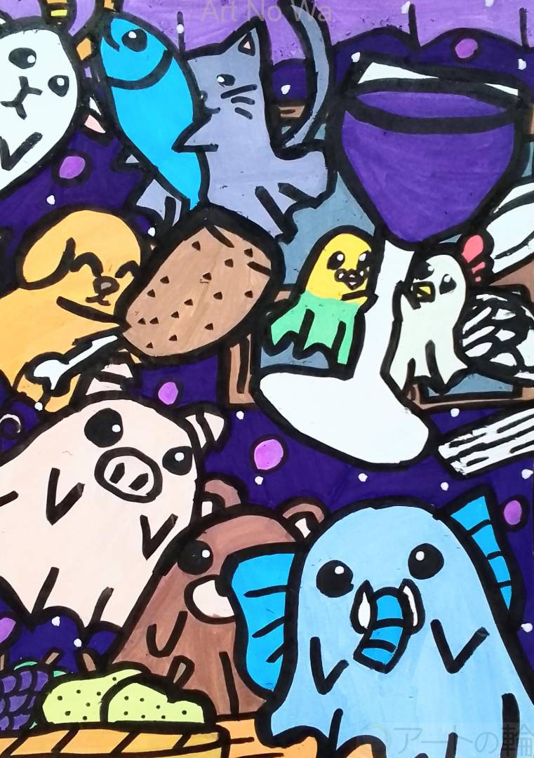 色んな動物お化け達がご馳走を用意してパーティーを始めようとしている様子を描いてみました。