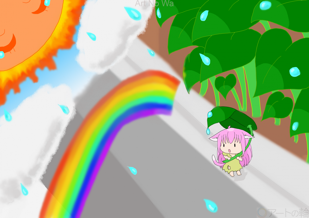初作品。小人の子猫「こねこびと」の女の子の旅の1ページ。突然の天気雨、実は太陽さんが泣いている。でも、すぐに泣き止むから大丈夫だよ、虹がそう言っているように思う、こねこびとなのでした。