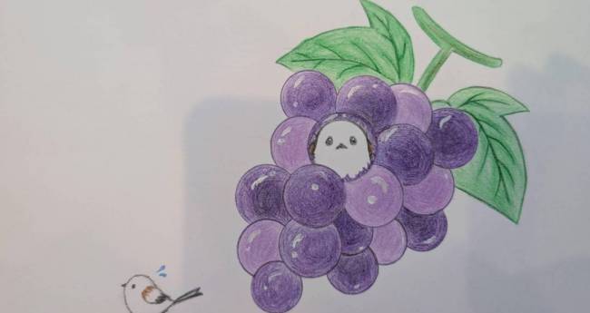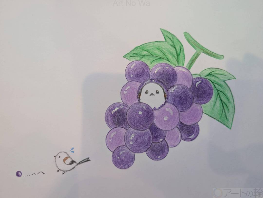 葡萄を粒を食べて顔出しのシマエナガを描いてみました