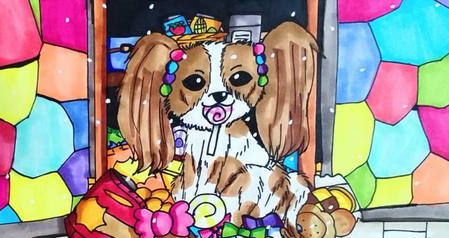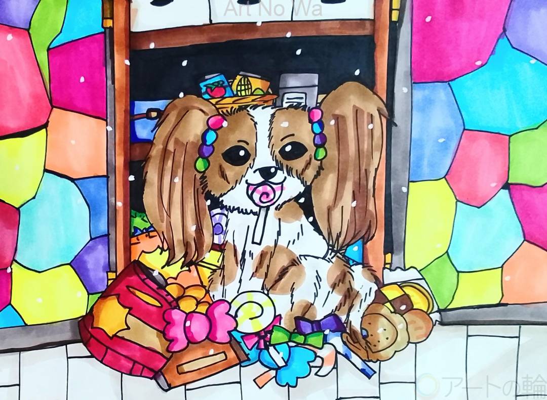 クローゼットの中からお菓子を盗んで食べているパピヨン犬を描いてみました。