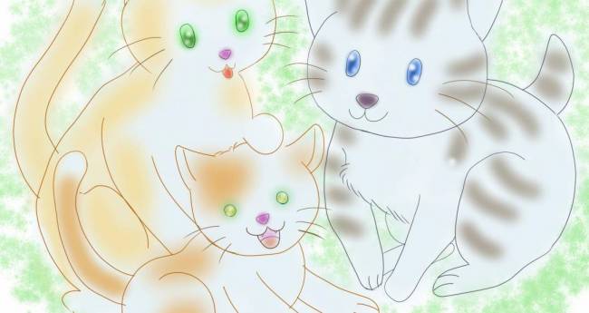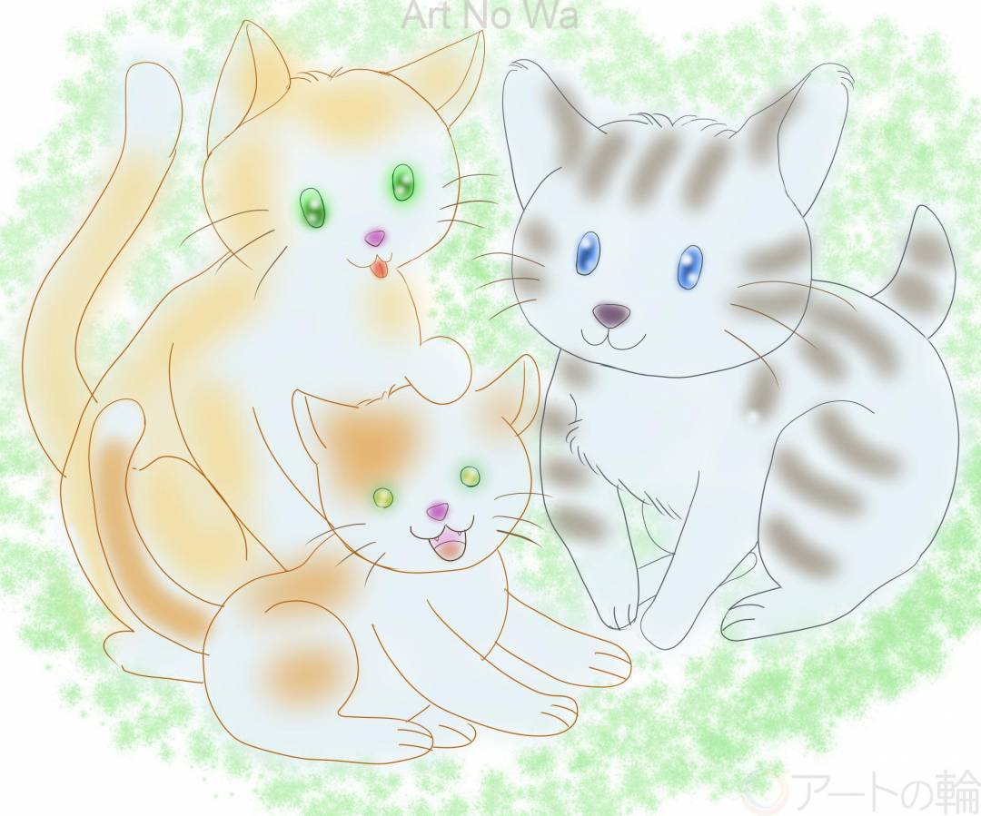 歴代の3匹の猫がモデルです。とても仲の良い3匹でした。茶系2匹は親子です。