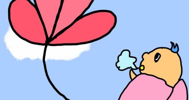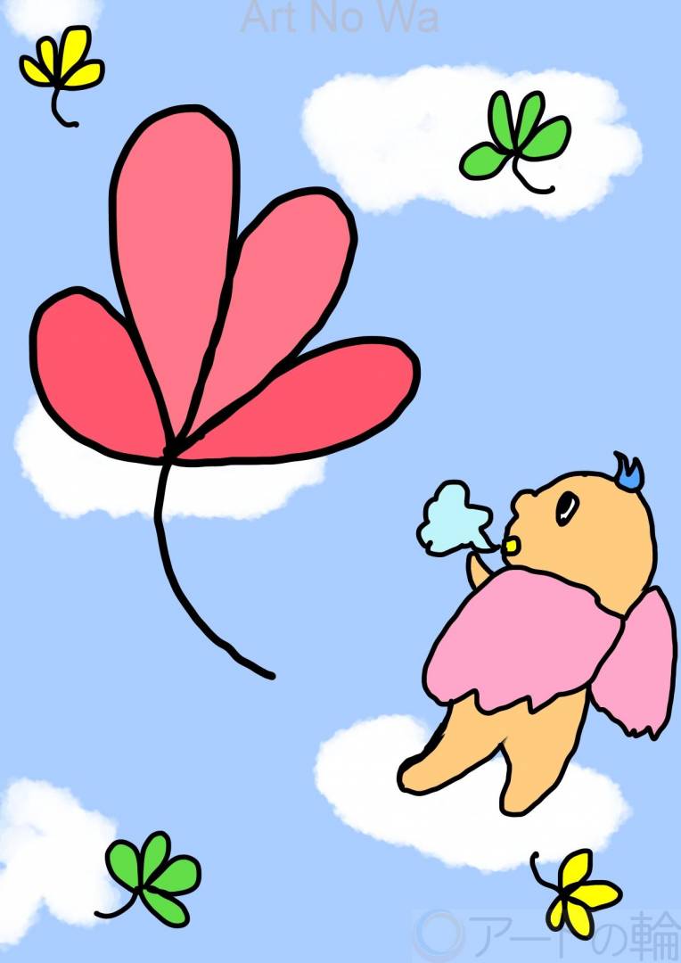 非現実,屋外,自然,赤,黄色,緑,水色,青,白,黒,想像上の生き物,明るい,たのしい,かわいい,わくわく