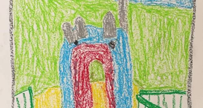 山口県の笠戸島にいるトリケラトプスをクレヨンで描きました。
