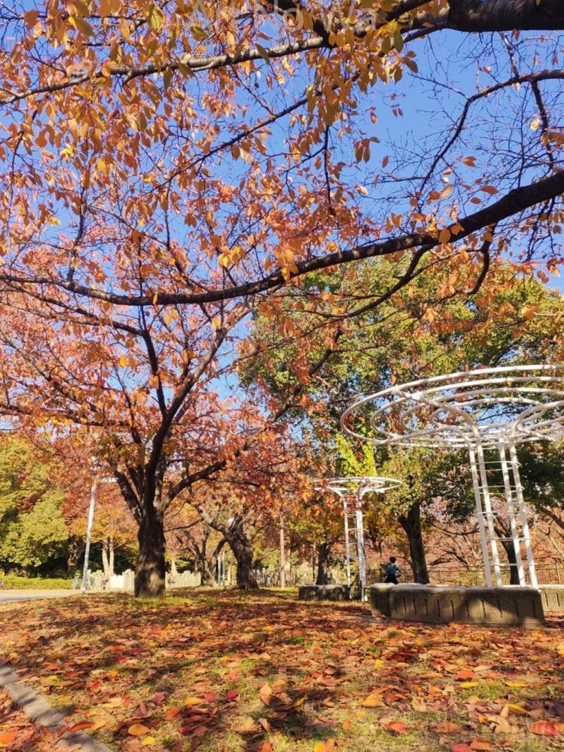 現実,屋外,自然,山,公園,現在,秋,11月,赤,オレンジ,黄色,水色,青,植物,風景,明るい,たのしい,2D