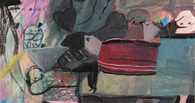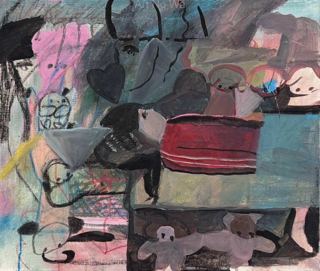 休みの日、女の子が何かを考えながら横になっているところを描きました。女の子の周りには、現実には存在しない犬のような守護神のような者がいて、女の子を守っています。