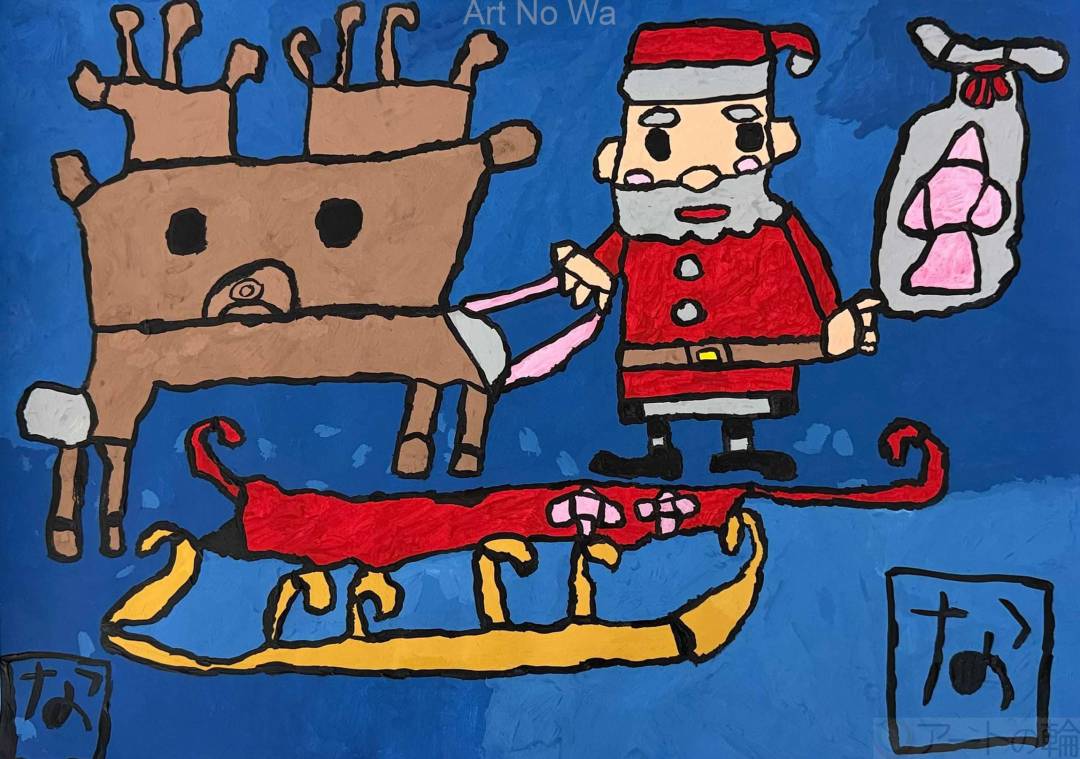 サンタさんが子ども達にプレゼントを届けているところを描きました。