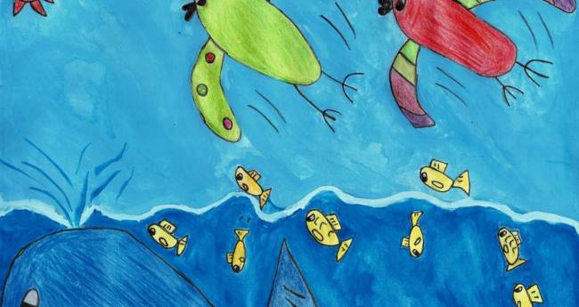 僕の中で魚は海で泳いでいるものだけど、もしかしたらジャンプするのかなぁと想像して描きました。