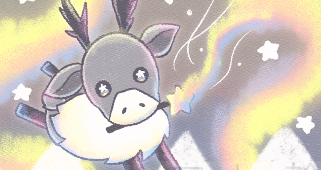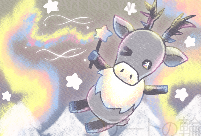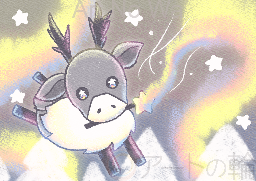 黄色や赤などで構成されたグラデーションを持つオーロラができ、満足そうにステッキを咥えながら全体を塗りつぶすトナカイさんです。