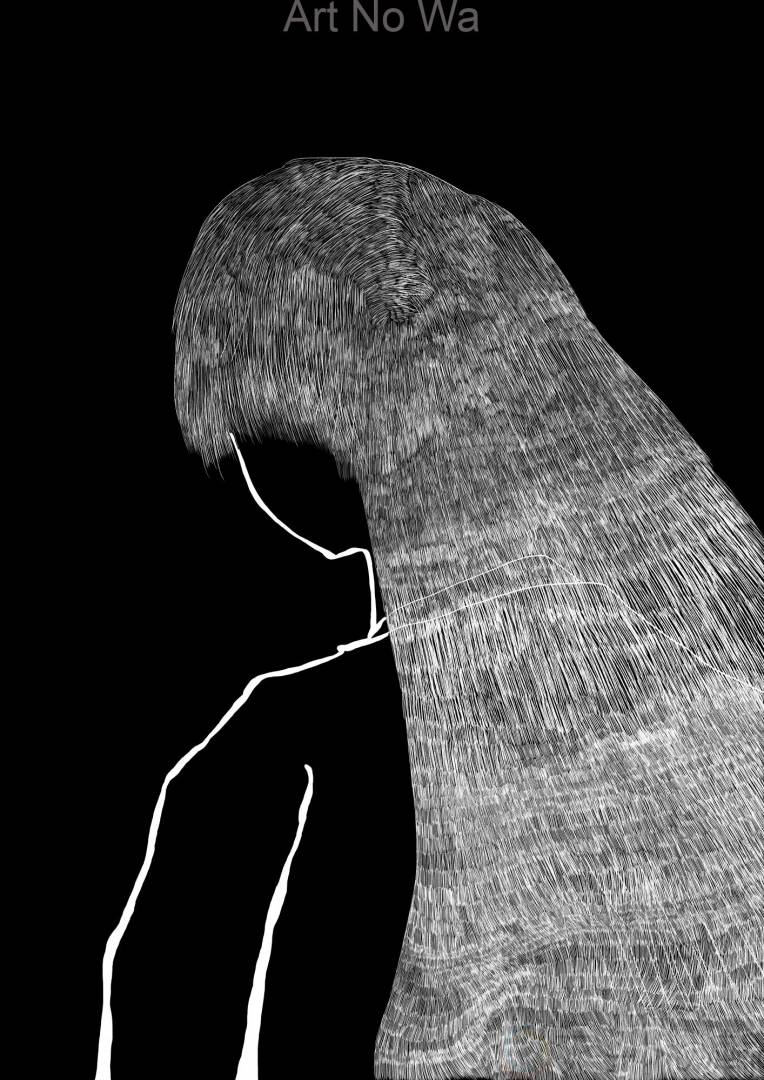 ただただ漠然と、長い髪を描き始めて完成しました。しかし描き終わって、『ところでこの人は誰なんだろう』という疑問にぶつかりました。子供の頃に憧れたお姉さんだったか、はたまた学生時代に恋したあの娘だったか、それとも…。一つ確かなのは、決して振り向くことはないということでしょうか。