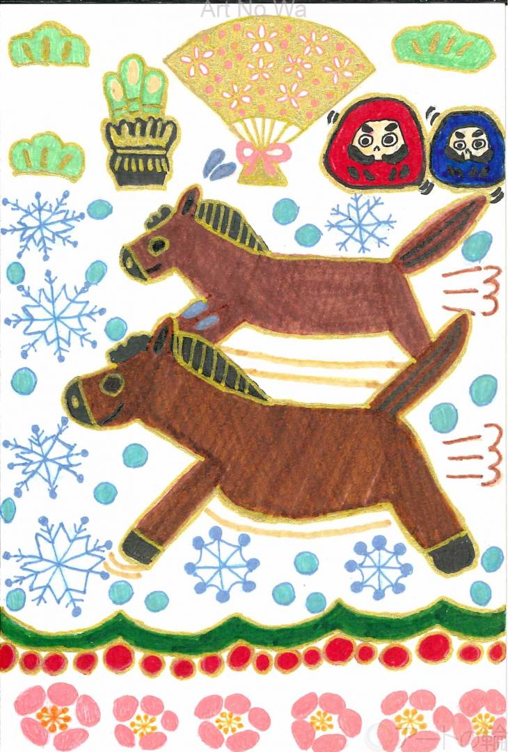2026年はウマ年ということで、おウマさんが走っている姿を“新しい年”に“新しい挑戦”を始めようとしている人々と重なるかなとピンっと浮かんできて、こちらを描きました。 雪や梅など冬をイメージしたモチーフも添えてみました