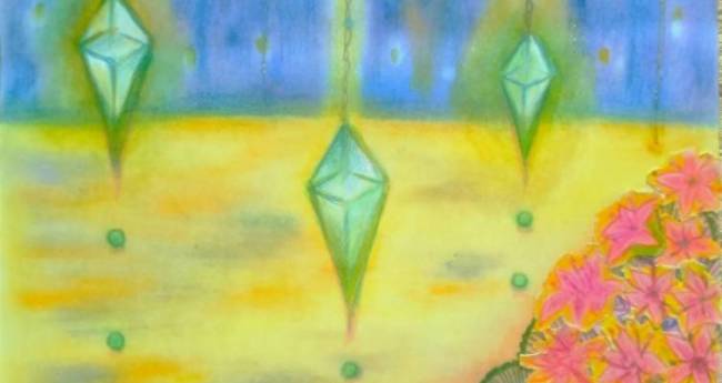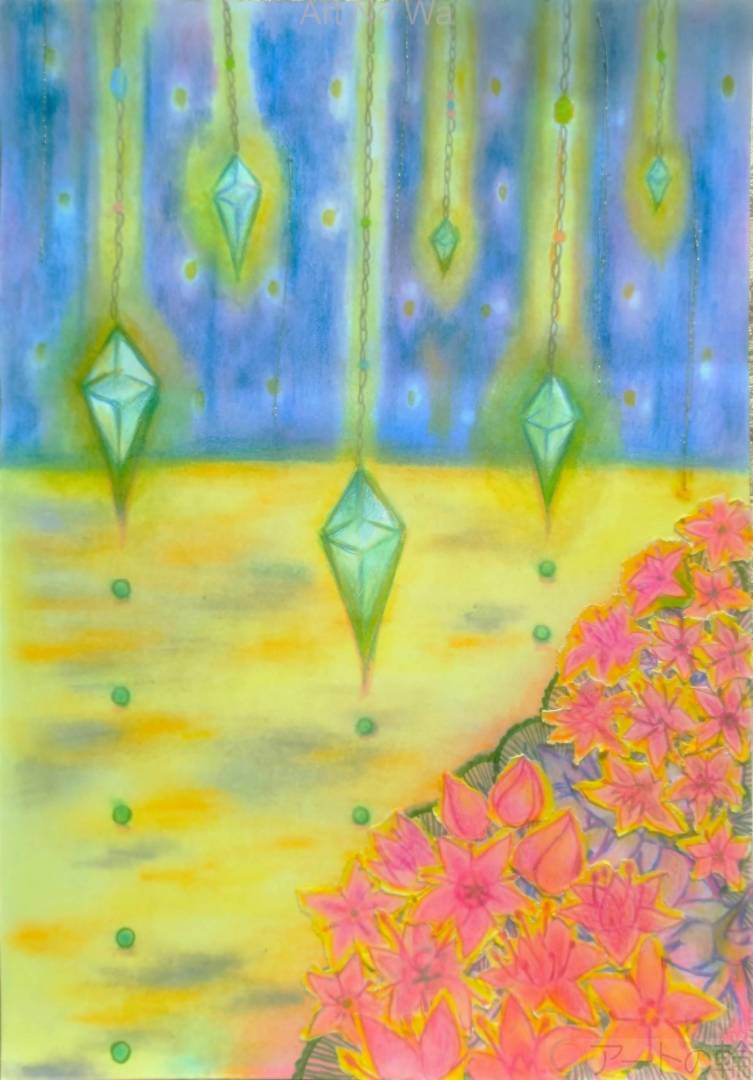 ダイヤの「宝物」から連想し、ミセバヤの花を1つずつ描きちぎり絵にしています。花言葉はタイトルの「大切なあなた」です。空は星が降るイメージでラメ入りの細糸を貼り幻想的であたたかな雰囲気に仕上げました。