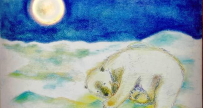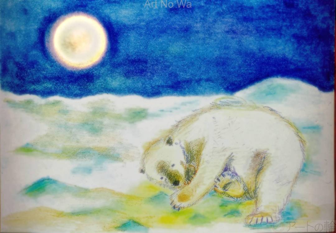 今年はクマにまつわるニュースをよく聞きました。怖いと思う一方で複雑な思いもあります。一匹寒空の下眠るシロクマは寂しげですが、春を待つわくわくした思いも抱いているイメージで描きました