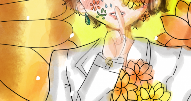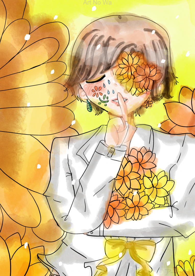「変わらぬ愛」と「信頼」というマリーゴールドの花言葉に合わせて描いてみました。男性が花束を持ってあなたに伝えようとしていますね。