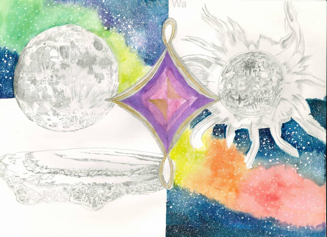 ダイヤを真ん中に月と太陽と海と星を描きました。あい色のところが気に入っています。