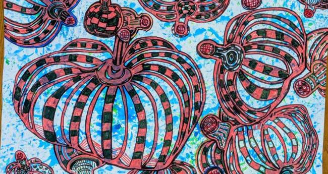 非現実,屋外,自然,レトロ,秋,ハロウィン,10月,赤,オレンジ,黄色,緑,水色,植物,静物,想像上の生き物,明るい,たのしい,かわいい,わくわく,どきどき,びっくり,2D
