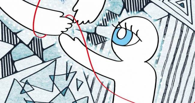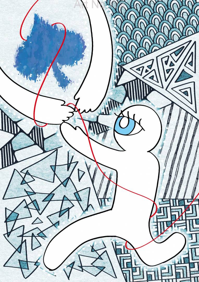 トランプのスペードのモチーフと「冬」「挑戦」「力」などをイメージして描きました。他の投稿作と合わせると赤い糸が一本に繋がります。アートでつながるを表現しました。