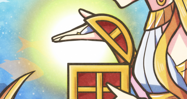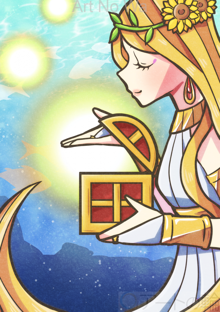 海底の秘密の宝箱から、女神に導かれるまま、未来への輝きが漏れ出す様子を描きました。