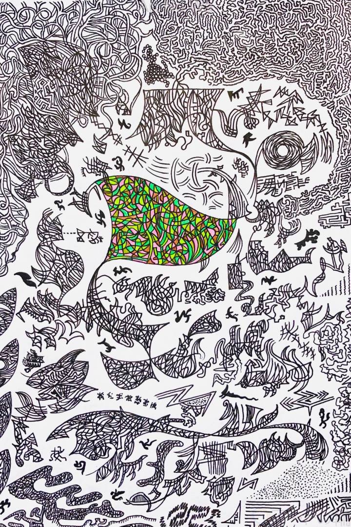 生物や自然、命のエネルギーをイメージして描きました。これまではカラフルな絵が多かったのですが、この作品から作風が一変し、緻密で複雑な模様を描くようになりました。愛知県主催の公募展「あいちアール・ブリュット展」では優秀作品に選ばれたため、非常に思い入れのある一作です。